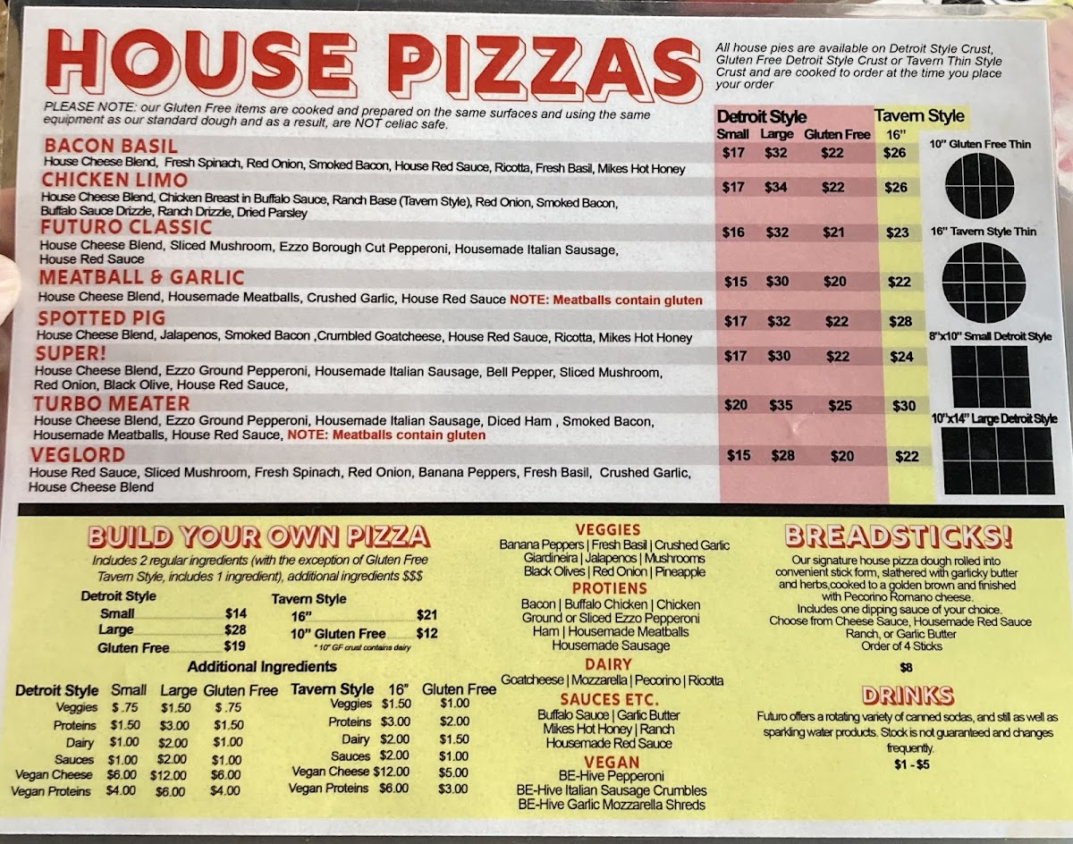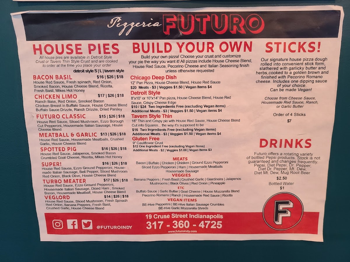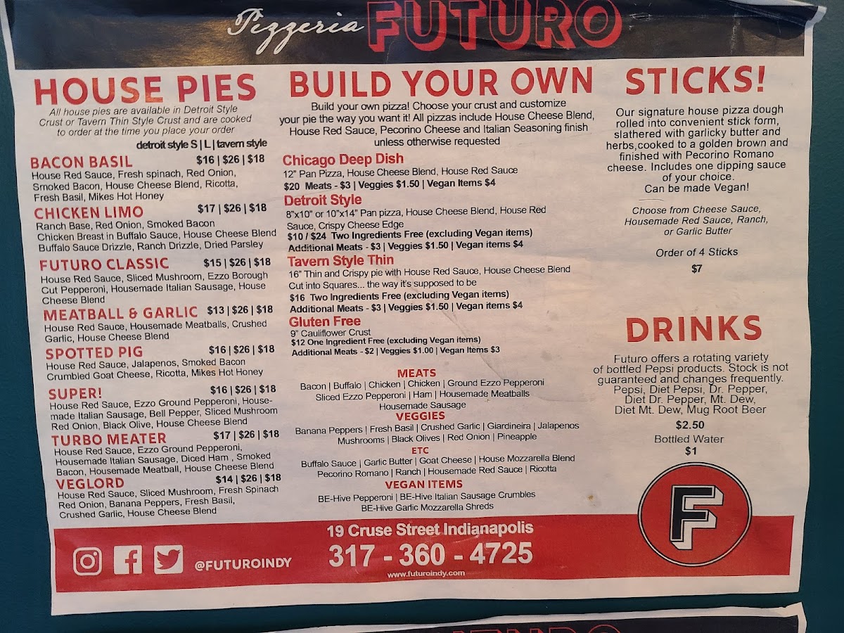 Housemade red sauce and pecorino romano are included. Two ingredients included (non-vegan). Choose from the following. All vegan ingredients $3 upcharge each, $2 upcharge for additional non-vegan ingredients after the included two.